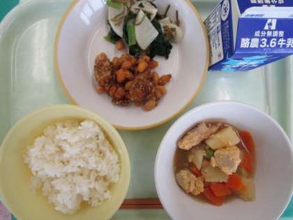 今日の給食の献立は、ご飯、牛乳、大豆とホタテのごまからめ、昆布和え、卵とじ です。今日の献立は、カルシウムがたくさんとれるように、高野豆腐、小松菜、大豆、昆布が使われています。給食は、一日に必要なカルシウムの半分の量がとれるように工夫されています。残さず食べて、丈夫な歯や骨をつくりましょう。