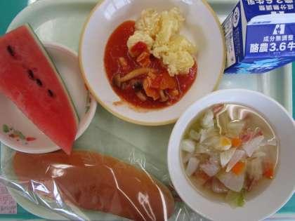 今日の給食の献立は、コッペパン、牛乳、鶏肉のトマト炒め、チーズポテト、マカロニスープ、すいか です。