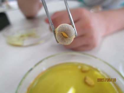 理科の学習では、ヨウ素液を使ってインゲンマメの子葉にデンプンがあるか調べました。子供たちは楽しそうに実験に取り組んでいました。