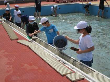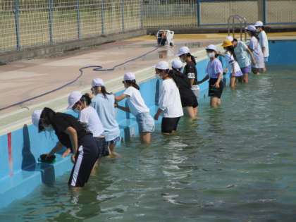 水泳学習の実施に向け、4〜6年生がプール清掃に取り組んでいます。今日は、5,6年生がプール内の清掃をしてくれました。2年ぶりのプール。楽しみですね。