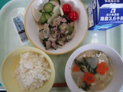 今日の給食の献立は、ご飯、牛乳、豚肉の塩こうじ炒め、かぶのいろどり、ミニトマト、すいとん、のり佃煮です。