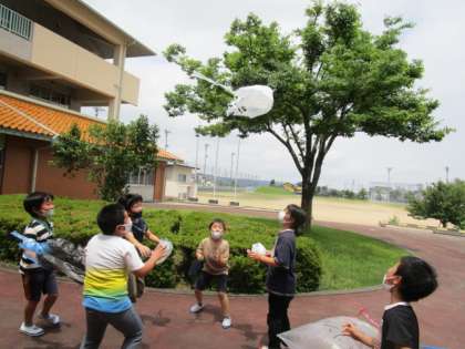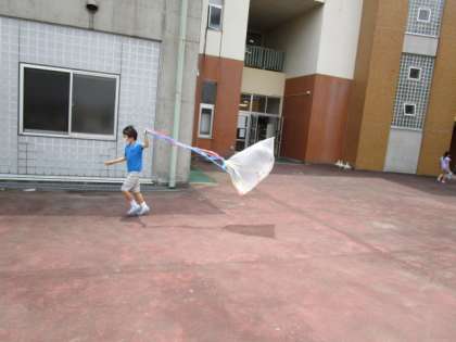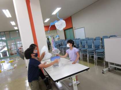 図画工作科の学習の様子です。送風機の上向きの風でビニール袋を浮き上がらせることを楽しみながら表したいものを考えたり、浮かんだり動いたりする動きを楽しんだりしました。幸いなことに、今日は気持ちのよい風も吹いており、外に出て自然の風を使って楽しむこともできました。