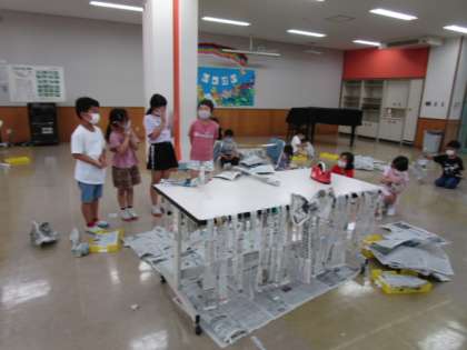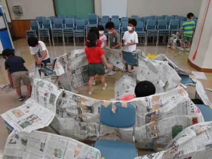 「新聞紙となかよし」という学習をしました。友達と協力して、大きな家を作ったり、一人用のテントを作ったりするなど、一人一人が自分のやりたいと思う気持ちを大切にして活動しました。