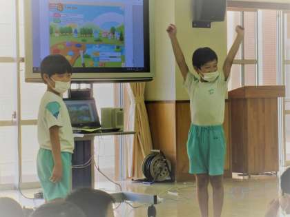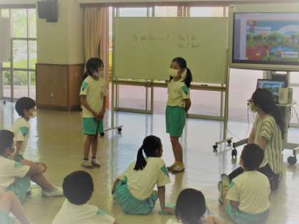 外国語の時間では、子供どうしでも英語の会話ができるようになっています。今日は、お互いに「好きな色」を聞き合いました。「Do you like blue?」「 Yes,I do!」 初めは、はずかしがっていた子供たちも、すぐに英語で聞き合えるようになりました。