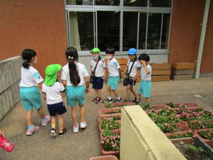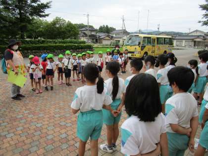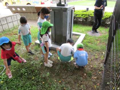 短い時間でしたが、手をつないで学校前や畑付近を手をつないで散策し、植物を見たり、虫を探したり楽しい時間を過ごすことができました。