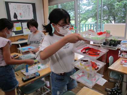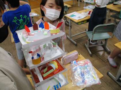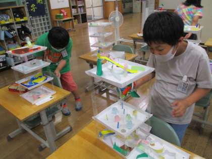 図工の時間に作った「コロコロガーレ」、友達の作品で遊ばせてもらいました。目隠しトラップやすべり台など、様々な仕掛けが立ちはだかり、ゴールするのに四苦八苦する子供たち。「まさかそんなことがっ」「これ面白いね」とつぶやきながら友達の発想にふれ、自分の栄養にしている子供たちでした。