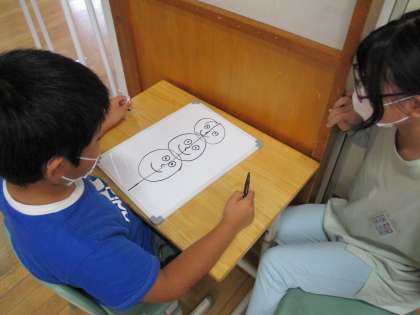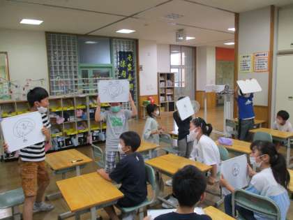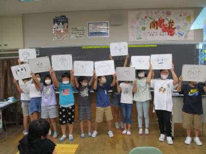 ○心といえば?!と問いかけると、真心、恋心、乙女心などなど、すてきな言葉がたくさん返ってきました。そんな中から、今日は「絵心」をテーマに学習しました。お題を知らないペアの友達に、何を、どこに、どのくらい描けばいいか指示して絵を仕上げました。傑作がたくさん生まれ、教室が笑いに包まれました。