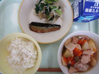 今日の給食の献立は、ご飯、牛乳、鶏肉と野菜のうま煮、いわしの梅煮、塩ナムル です。