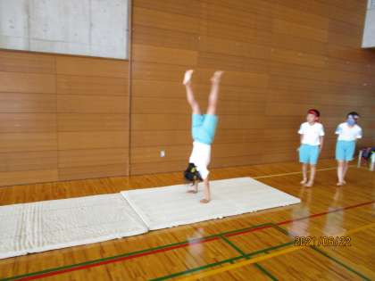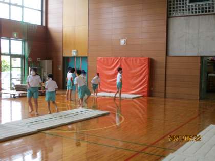 今日の体育科の学習では、マット運動を行いました。一人一人ができる技を増やそうと、いろいろな技に挑戦していました。壁倒立にも思い切って取り組むことができました。