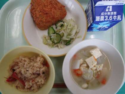 今日の給食の献立は、五目ご飯、牛乳、アジフライ、きざみ和え、打ち豆汁 です。