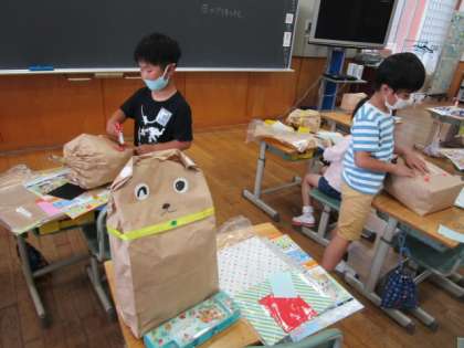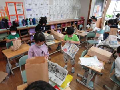 子供たちは、自分の顔もすっぽり入るくらい大きな紙袋に驚いていました。この袋をくしゃくしゃして、中に新聞紙を入れてできた形から、自分の表したいものを表現していきました。少しずつ形ができてくると、総塑像を膨らませ、うさぎやかめなどを表していました。