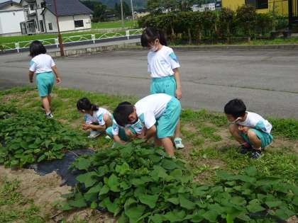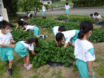 久しぶりにさつまいも畑に行くと、少し前の姿とは大違いで、つるがたくさん伸びていました。その周りには、草も多く生えていたので、みんなできれいにすることにしました。草むしり後は、両手にいっぱいの草を持って片付ける姿や汗びっしょりになりながら達成感あふれる表情が見られました。秋には、大きなさつまいもができるといいですね!