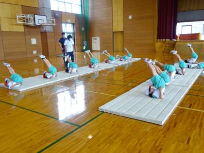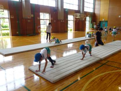 今日は、スポーツ指導員の方4名をお招きし、マット運動を教えていただきました。前転ができるようになるために、手のつき方や足の動かし方を学びました。