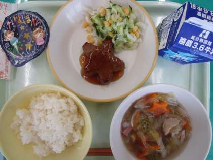 今日の給食の献立は、「七夕献立」です。ご飯、牛乳、星形ハンバーグ、コーンサラダ、天の川スープ、七夕デザート です。