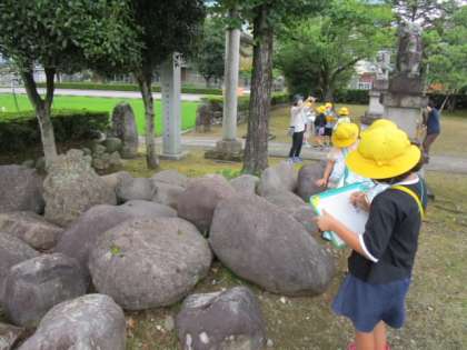 今日は町探検で学校前の神明宮へ行きました。神明宮には狛犬や鳥居など様々な物があり、それについてメモをとりました。銀杏の木に大きなサルノコシカケを見付けるなど、おもしろい物がたくさん見つかりました。