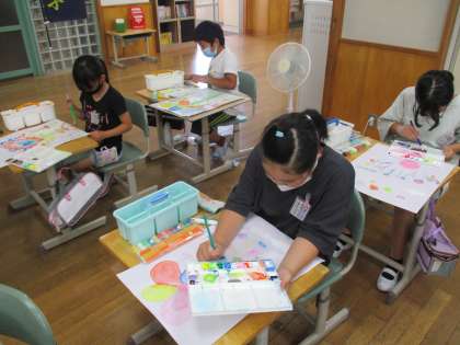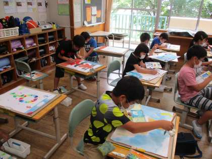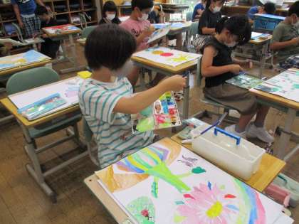 図工の時間に想像を膨らませて「まぼろしの花」を描いています。こんな花が、あんな場所にあったらすてきだな、と考えながら混色や筆遣いに気を付けながら仕上げています。