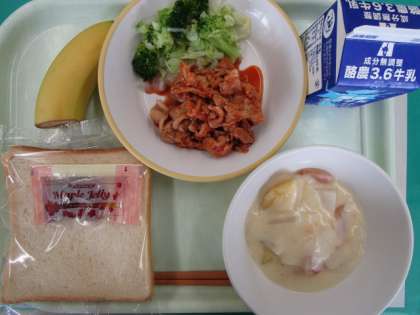 今日の給食の献立は、食パン、牛乳、ポークチャップ、そえ野菜、かぶのシチュー、バナナ、メープルジャム です。