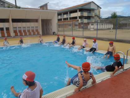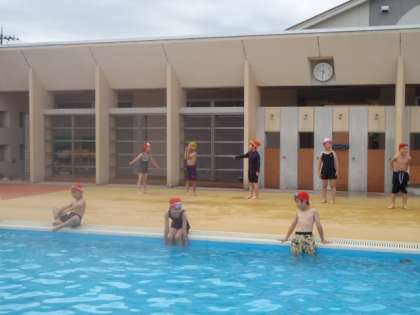 2回目の水泳学習をしました。プールの使い方を少しずつ覚えて、スムーズに準備をすることができました。プールでは、水に慣れながら、顔を水につけたり、息継ぎの練習をしたりするなど行いました。