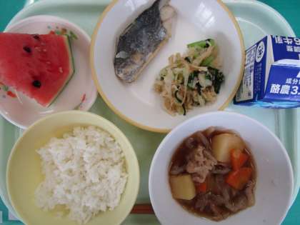 今日の給食の献立は、ご飯、牛乳、肉じゃが、サワラの塩焼き、はりはり和え、スイカ です。