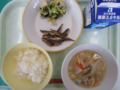 今日の献立は、ご飯、牛乳、小あじのから揚げ、チンゲンサイひたし、豚汁です。