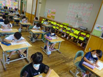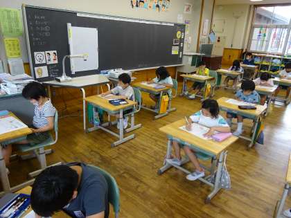 初めての学習のたしかめに取り組む1年生です。分からない問題があっても諦めずに問題を解いていました。今週から宿題の他に、自主学習も頑張っており、どんどん力が付いてきていますね!