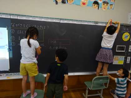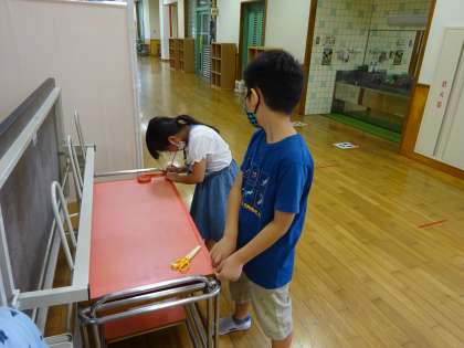 算数科では、教室内にあるいろいろな物を長さを調べています。「はしをそろえること」と「まっすぐにすること」を意識して、テープに写し取りました。「黒板の縦の長さを測ってみたいな!」「ロッカーと机を比べるとどっちが長いかな?」などと、楽しんで活動しました。