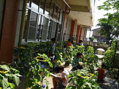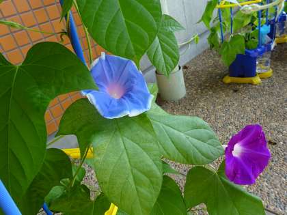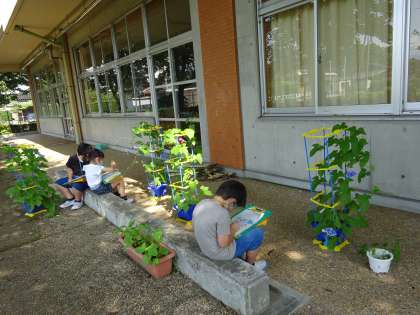 1年生の教室前のテラスは、アサガオの花が満開です!うすい青、紫、ピンクと色とりどりに咲いています。次は何色の花が咲くのでしょうか?