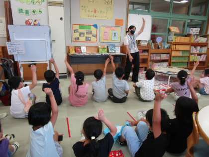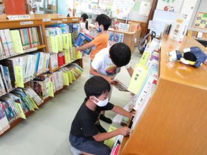 今日は夏休みに読む本を5冊借りました。2冊は少し頑張って読む本を、3冊は好きな本を選びました。宇宙の本や妖怪の本など思い思いの本を選びました。