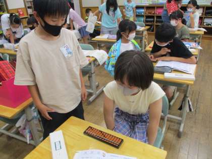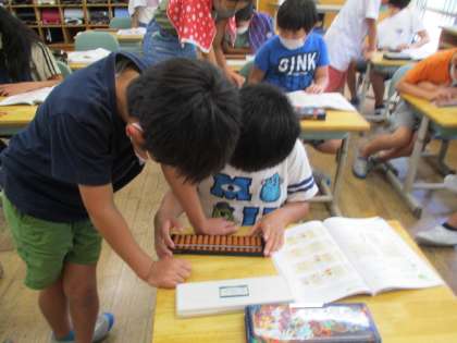 算数の時間にそろばんを使って簡単な計算をしました。繰り上がりや繰り下がりも慣れてくると速く計算できるよさを感じ、楽しんで取り組みました。
