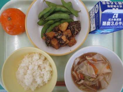 今日の献立は、ご飯、牛乳、高野豆腐とレバーのごまからめ、枝豆、ワンタンスープ、冷凍みかん です。
