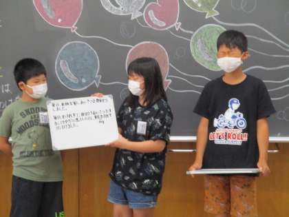 4年生の子供たちは、朝から見通しをもって落ち着いて過ごし、粛々と始業式に臨んでいました。頼もしい限りです。学級活動では、夏休みに毎日チャレンジしたことの振り返りをして学びを伝え合ったり、「お絵かきリレー」をして楽しんだりしました。