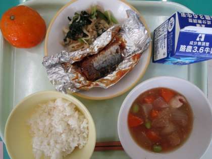 今日の給食の献立は、ご飯、牛乳、さばの銀紙焼き、はりはり和え、冬瓜の吉野煮、冷凍みかん です。
