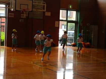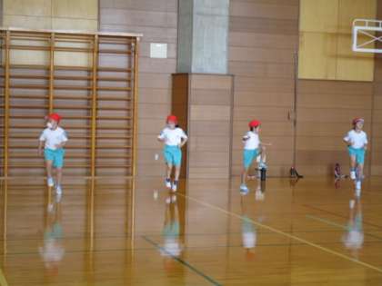 アリーナで思いっきり体を動かして運動しました。基本となるステップやストレッチを組み合わせながら、速く走るための運動に取り組みました。