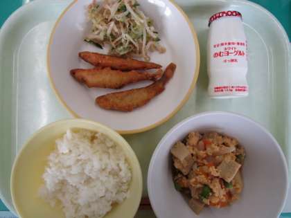 今日の献立は、ご飯、高野豆腐の卵とじ、わかさぎのフリッター、甘酢和え、飲むヨーグルト です。「フリッター」というのは、ラテン語で「揚げ物」という意味があります。パン粉を付けて揚げるフライはサクサクとした食感ですが、フリッターは、小麦粉の衣にメレンゲを加えるので、フワフワとした食感になるのが特徴です。