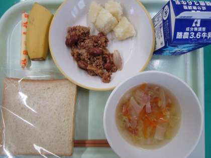 今日の献立は、食パン、牛乳、チリコンカン、こふきいも、野菜スープ、バナナ、棒チーズ です。