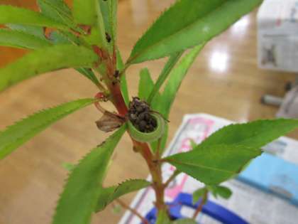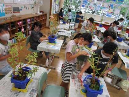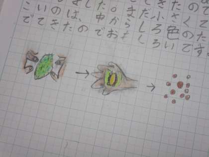 夏休み中は家庭に持ち帰り、お世話と観察を続けたホウセンカ。よく見ると、花が散った後には、ふっくらとした実がたくさんできていました。実を取ってみると、はじけて飛び出す「種」。たった4粒しか植えていないのに、ひとつの実にはたくさんの種ができていました。種を取ることを通して様々な気付きがあり、考えたことを自分から発表する姿が見られました。