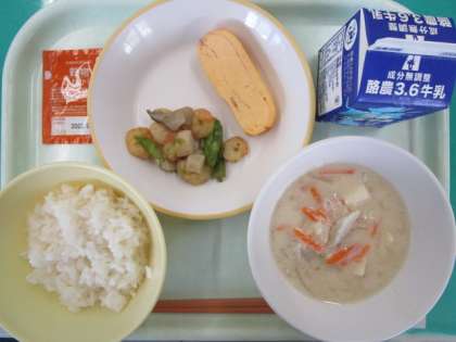 今日の献立は、ご飯、牛乳、厚焼き卵、えびときのこのガーリックソテー、呉汁、穀物ふりかけ です。