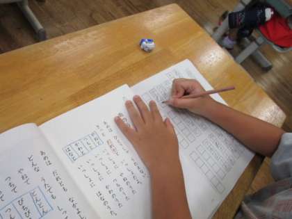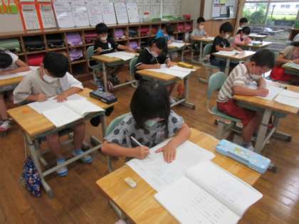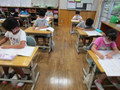 書写の時間に、国語の教科書に載っている詩「雨のおと」を視写しました。字をよく見て、集中して書きました。