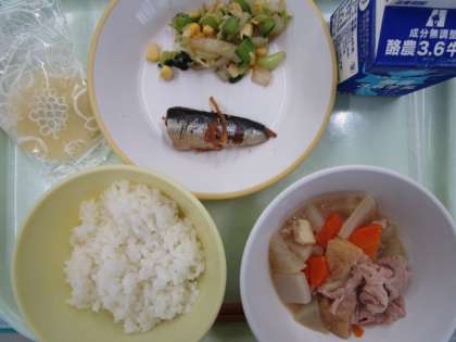 今日の献立は、ご飯、牛乳、大根の味噌煮込み、いわしの生姜味、コーン和え、冷凍パイン です。