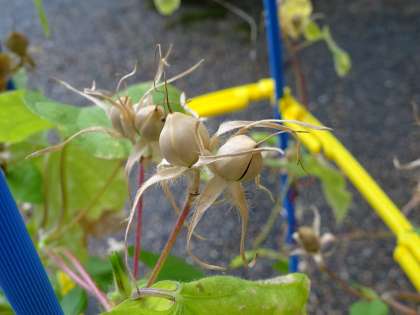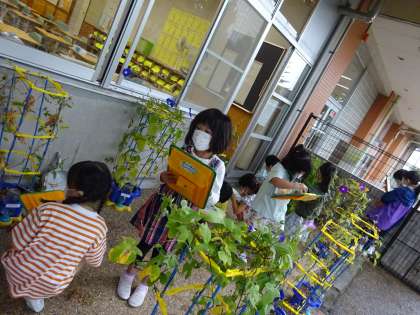 夏休み中、アサガオの観察を続けていた子供たち。今日、観察してみると、1学期に見た様子と変わったところが多くあったようです。「花がしぼんだ後は、丸い緑色のものができたよ」「その後は、茶色になっている!」などと、種ができるまでを詳しく観察していました。一つの実から3〜5こほど種が出てくるのを、嬉しそうに採っていました。