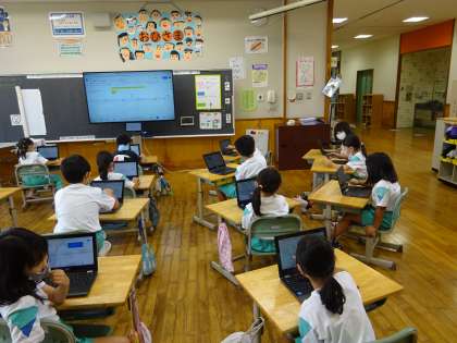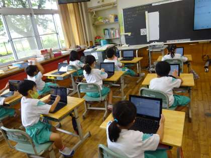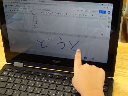 2学期に入ってから、少しずつクロムブックの使い方に慣れてきた1年生です。今日は、手書き機能を使って、しりとりをしました。「どんどん思いついたよ!」「使い方分かったよ!」などと、楽しそうに使っている姿が見られました。