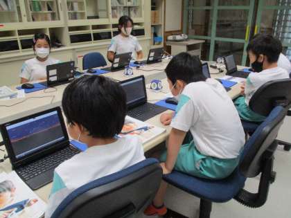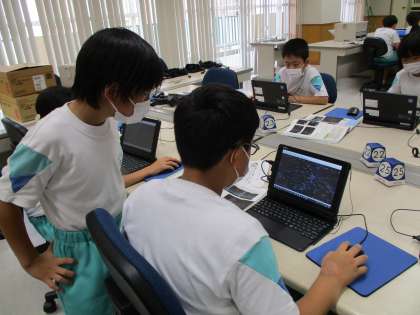 理科では、月と星の見え方について学習しています。今日は特別なソフトを活用して、様々な星がどの方位に動くのか映像を通して学びました。