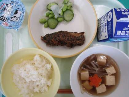 今日の給食の献立は、ご飯、牛乳、ふくらぎのエゴマ揚げ、枝豆のマリネ、豆腐スープ、ヨーグルト です。