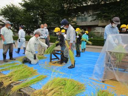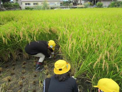 今日は、5月に植えた稲の稲刈りをしました。稲刈りの大変さや農家の方への感謝を、体験を通して感じることができました。稲刈りや千歯扱きを使うときのコツを教えていただいたり、自分で見付けたりして一生懸命に取り組んでいました。