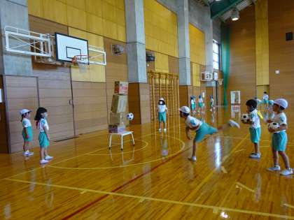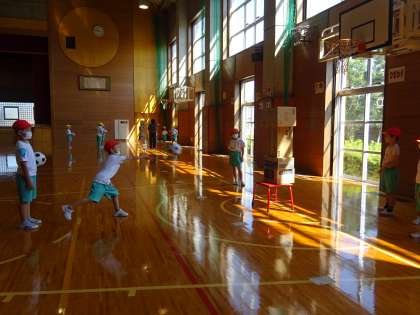 友達のボールを1回のバウンドやバウンドなしでキャッチできるようになってきた1年生です。今日は、ダンボールを的にして、全部倒れるにはどうしたらよいか考えながら投げました。投げるフォームや当てる場所など色々なことに気をつけながら運動しました。