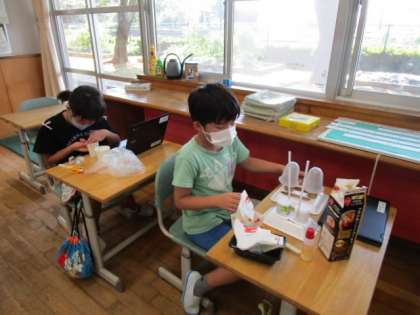 家から持ってきた空き箱やペットボトルから、動くおもちゃを作りました。子供たちは、作り方を動画で見たり、友達に聞いたりしていました。