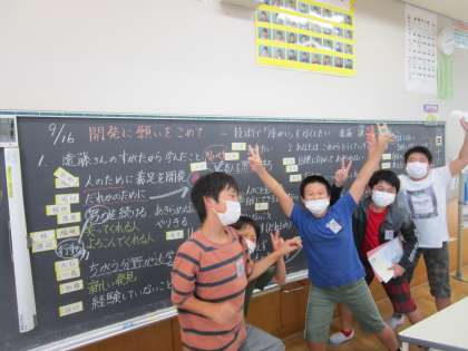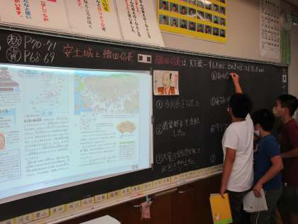 写真は上から、社会科「戦乱の世から天下統一へ」、道徳科「技術で障害をなくしたい 遠藤 謙」、外国語科「Summer Vacation」の学習の様子です。