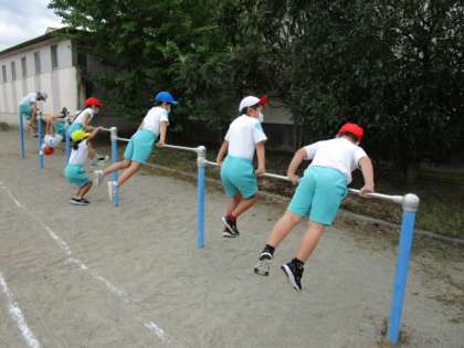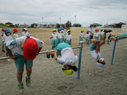 鉄棒を使ったいろいろな遊びに挑戦しています。今日はそれぞれの遊びをつないで一連の遊びにしました。難しい遊びにも楽しみながら取り組んでいます。