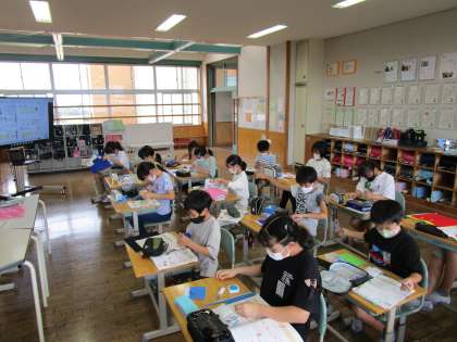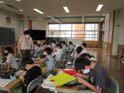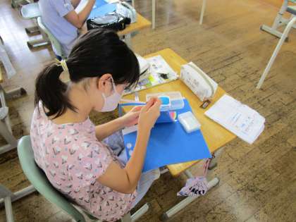 家庭科の時間に裁縫セットやフェルトを使って作品を作りました。子供たちは、財布や教科書入れ、小物入れなどといった、日々の生活の中で使える物を針と糸で丁寧に縫って仕上げていました。