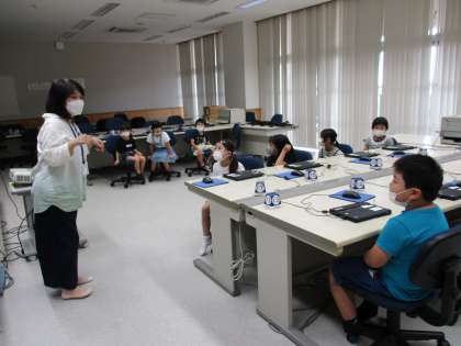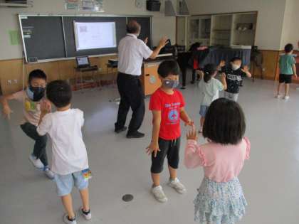 にこにこタイムにアピールタイムの練習を頑張った後でも、しっかりと切り替えて学習に取り組むことができる保内の1年生。3・4時間目は、初めてコンピューター室へ行き、パソコンに触れたり、音楽室でリズムに合わせて体を動かしたりする活動に取り組みました。
